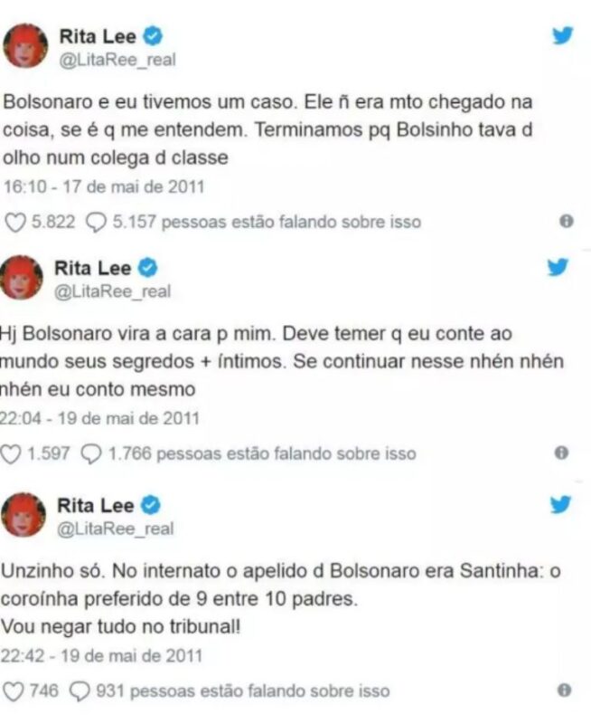Uma das plataformas utilizadas por Rita Lee para se expressar foi o Twitter, onde a cantora era bastante ativa e fazia piadas sobre sua própria vida e também a dos outros. Em 2011, a artista criou uma fanfic em que afirmava ter tido um “caso” com o então deputado federal Jair Bolsonaro. A história, que volta a circular nas redes sociais sempre que o tema é levantado, gerou muita polêmica na época.