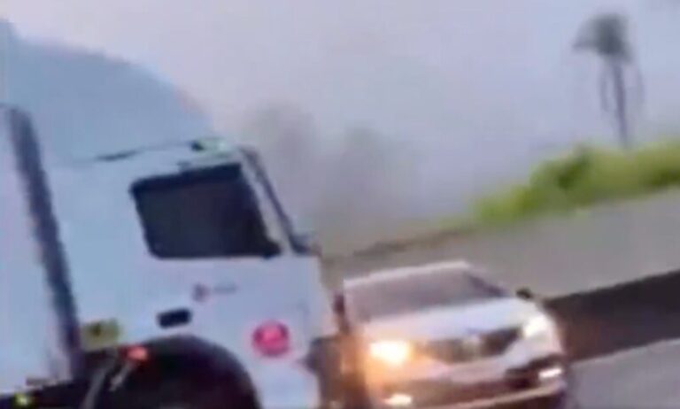 Suspeitos armados abordam motorista de caminhão, que acelera e arrasta veículo por quase um quilômetro. Veja o video: