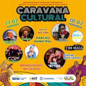A Secretaria Municipal de Cultura, Esporte, Lazer e Turismo (SMCELT) de Cachoeirinha, em colaboração com o Ministério do Turismo, está organizando a Caravana Cultural, um evento que contará com uma variedade de shows e apresentações especiais. Entre os destaques estão Baitaca, Pedro Ernesto Denardin, Guri de Uruguaiana, o grupo de pagode CDP, MC Jean Paul,Tributo ao Tim Maia e Dom Vittor. Além disso, haverá atividades especiais, como o baile do Finna e brinquedos infláveis para as crianças.