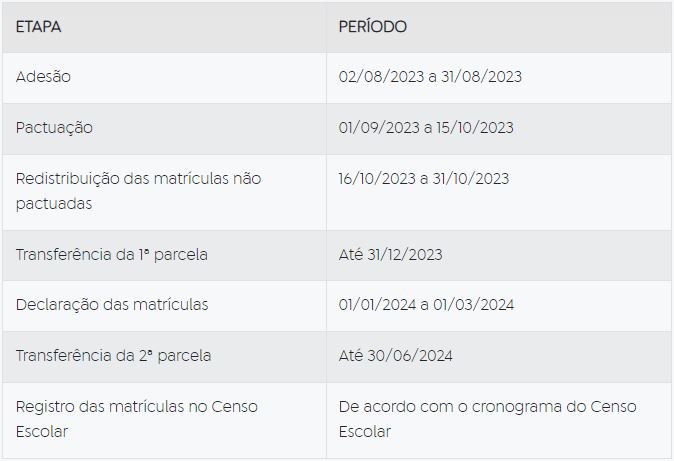 A transferência da primeira parcela será feita até o dia 31 de dezembro deste ano. No início de 2024, os entes federados que receberem o fomento terão o prazo de 1º de janeiro a 1º de março para declarar a efetivação das matrículas pactuadas. Após esse período, o MEC realizará o pagamento da segunda parcela.