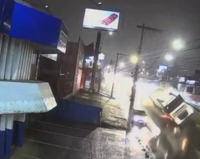 As imagens mostram que o veículo de carga chegou a se inclinar em direção à via inferior, mas o motorista do automóvel conseguiu desviar a tempo, evitando que o episódio tivesse consequências ainda mais graves.