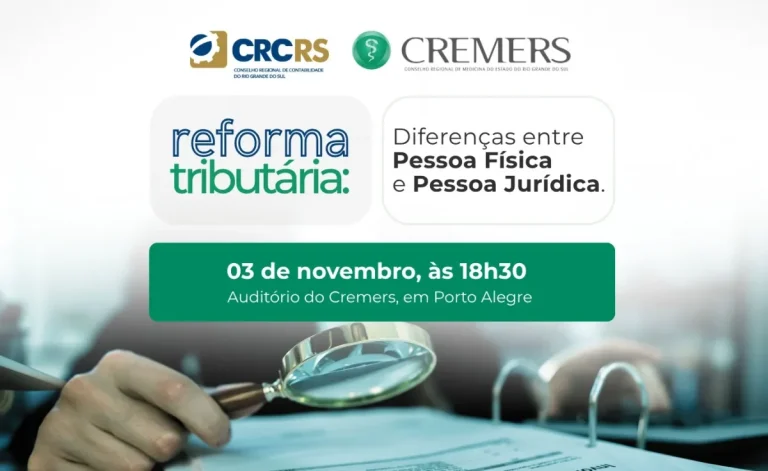 A reforma tributária está redesenhando o cenário fiscal e impactando diretamente os médicos. Para contribuir no entendimento desse contexto na rotina dos médicos Pessoa Física e Jurídica, o Cremers vai promover, no dia 3 de novembro, às 19h, na sede do Conselho, o evento ‘Reforma Tributária – diferenças entre Pessoa Física e Pessoa Jurídica’.