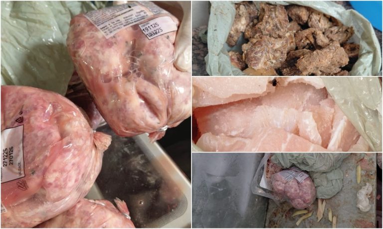 Os agentes apontaram situações críticas, entre elas freezers com carnes, frangos e peixes em processo de degelo armazenados de forma inadequada e misturados entre si, além de acumulação de sangue nos equipamentos, o que configura risco de contaminação cruzada. Foram encontrados queijos expostos sem identificação, preparações prontas mantidas sem controle de temperatura e a presença de moscas em áreas de armazenamento e sobre os alimentos.