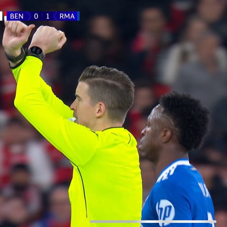 Minutos depois, já com o jogo prestes a ser reiniciado, Viní voltou a se irritar ao ouvir manifestações vindas da lateral do gramado e denunciou ofensas racistas ao árbitro. O juiz acionou imediatamente o protocolo antirracismo da Uefa, paralisando a partida por cerca de 10 minutos.