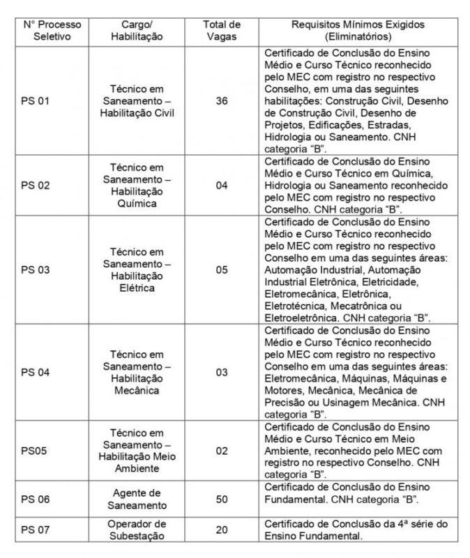 O Departamento Municipal de Água e Esgotos (Dmae) abriu processo seletivo simplificado para técnico em saneamento – habilitações civil, química, elétrica, mecânica e meio ambiente, agente de saneamento e operador de subestação. As inscrições para 120 vagas temporárias ocorrem até esta terça-feira (17), no site do Dmae.