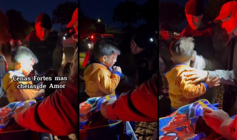 Com calma os policiais tranquilizaram a criança e realizaram os primeiros atendimentos, assegurando o bem-estar do menino. Em poucos minutos, o pequeno Martin já se encontrava calmo e conversando com os PMs, demonstrando a eficácia da ação rápida e atenciosa dos policiais.