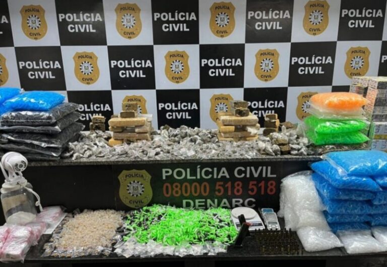 Durante a ação, os agentes cumpriram um mandado de busca e apreensão, encontrando drogas como crack, cocaína e maconha, além de diversos materiais usados para fracionamento e embalagem, como balanças e eppendorfs. Também foram apreendidos carregadores e munições de variados calibres.