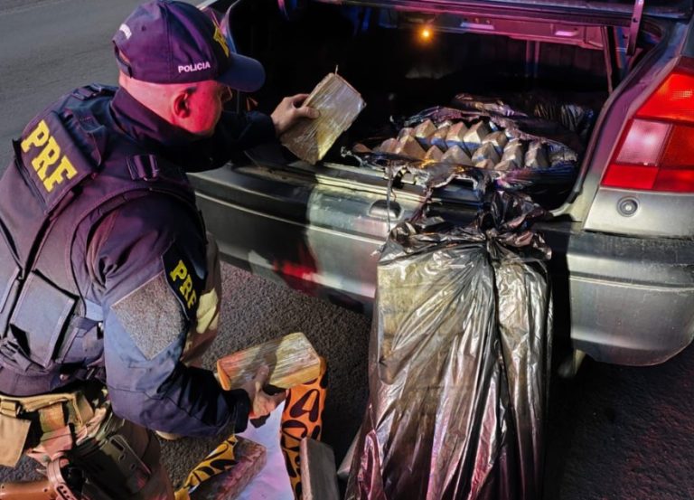 Na fiscalização, foram encontrados no porta-malas 105 tabletes de maconha e 5 de crack, totalizando 69,5 kg de maconha e 5,1 kg de crack.