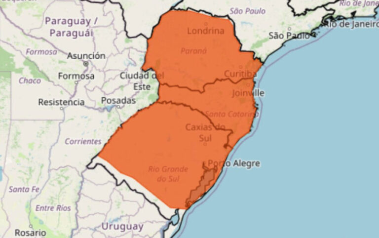As regiões do Paraná e do Rio Grande do Sul, juntamente com todo o Estado de Santa Catarina, estão sob alerta meteorológico devido à previsão de tempestades nos próximos dois dias. Conforme os especialistas, há possibilidade de ocorrência de chuvas intensas com volume acumulado de até 100 mm em um período de 24 horas, acompanhadas por ventos que podem atingir velocidades de até 100 km por hora, além da ameaça de queda de granizo.