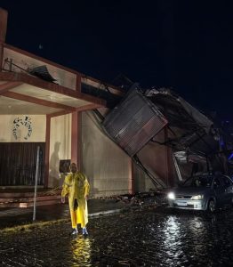 Entre os prejuízos estruturais, uma igreja centenária teve parte do telhado arrancado, um ginásio esportivo acabou completamente destruído e grandes pipas de armazenamento de vinho tombaram com a força do vento.