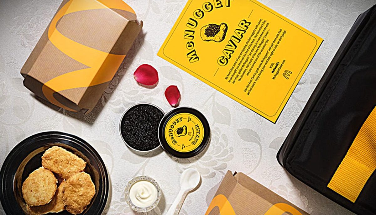 O McDonald’s lançou uma campanha especial para o Dia dos Namorados nos Estados Unidos, apostando em uma combinação incomum: McNuggets acompanhados de caviar Baerii. O produto, chamado McNugget Caviar, foi desenvolvido em parceria com a marca Paramount Caviar.